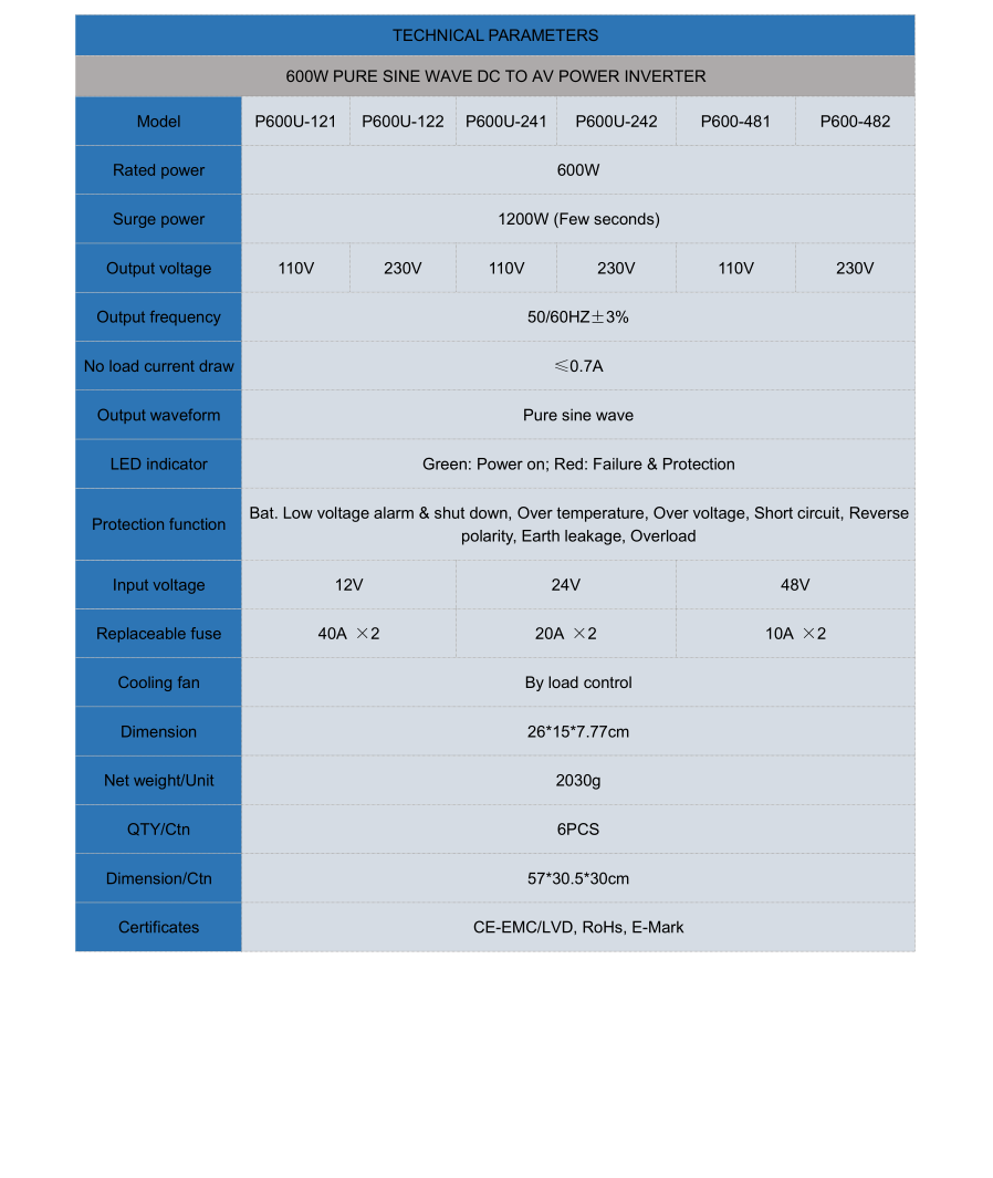 600W ಶುದ್ಧ ಸೈನ್ ವೇವ್ ಡಿಸಿ ಟು ಎಸಿ ಪವರ್ ಇನ್ವರ್ಟರ್